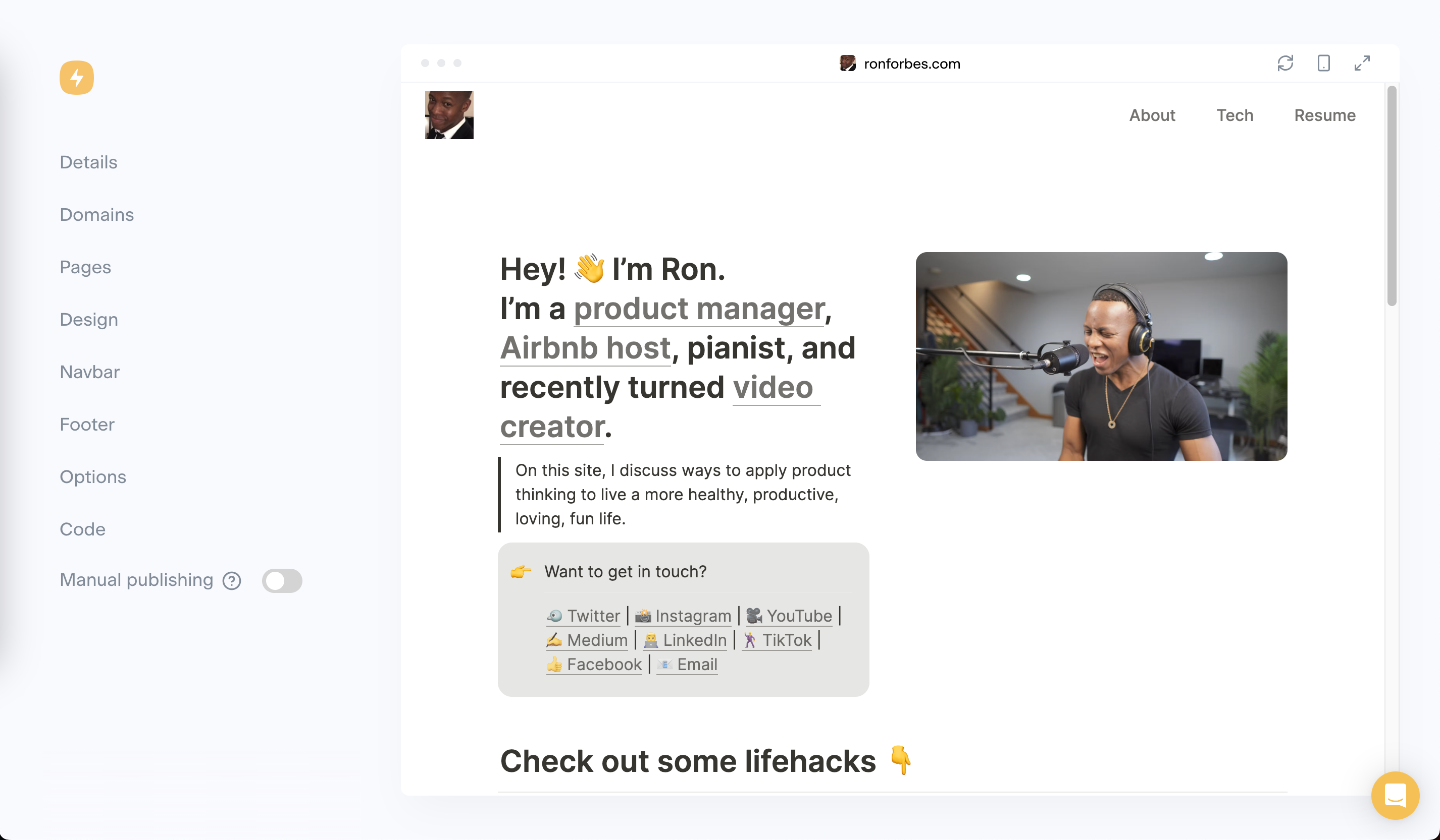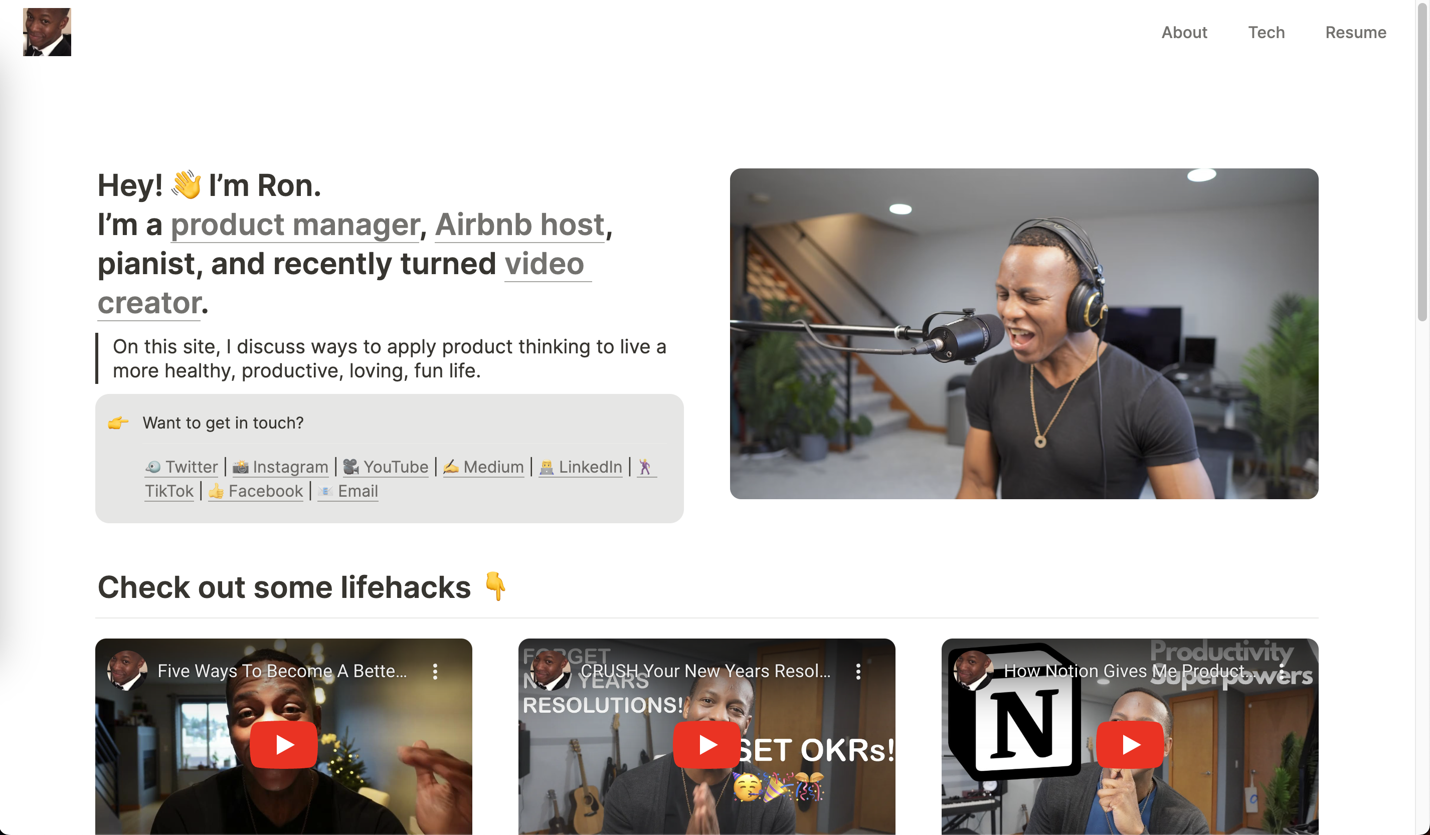 I use Notion as my second brain, and it helps me organize my life, from reflecting and setting intention with daily journal entries to taking meeting notes and tracking next steps. But one of the things I've enjoyed most about it recently is using it to host my personal website, ronforbes.com.