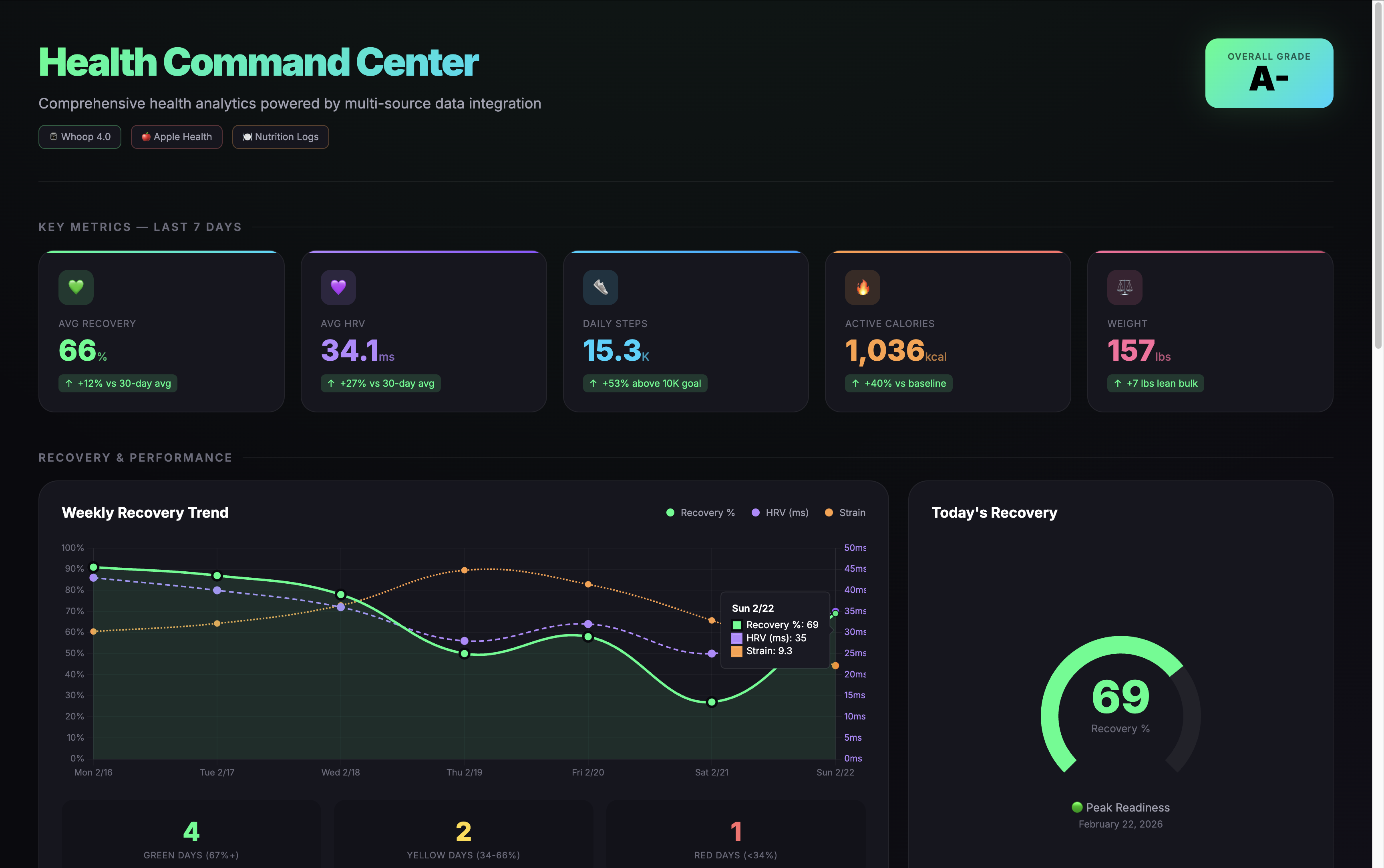 I was already collecting a ton of health data. Whoop for recovery and strain. Apple Health for steps and heart rate. Eight Sleep for sleep tracking. A smart scale for weight. The problem wasn't access to data. It was that the data lived in four different apps, and synthesizing it in my head was just enough friction that most days I'd skip it entirely.